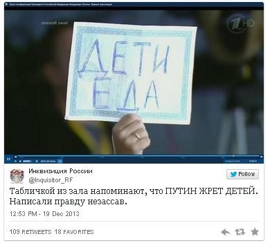 Корреспондент «Дождя»: «Вы много говорили про братский народ, но на Майдане довольно много негативных слов в адрес нашей страны». Путин: «Наверно, есть и у нас люди, настроенные националистически, и их тоже немало. Но подавляющее большинство российских граждан относятся к Украине позитивно. То же самое и на Украине». Говорит, что евромайданщикам нужно внимательно почитать документы, которые они требуют подписать от Януковича. «Читать-то вы умеете? Никто же не читает!» – переживает Путин за уровень грамотности братского народа. Советует Украине не становиться «сельхозпридатком Еврозоны». А мы, говорит, Украину никуда не тащим.