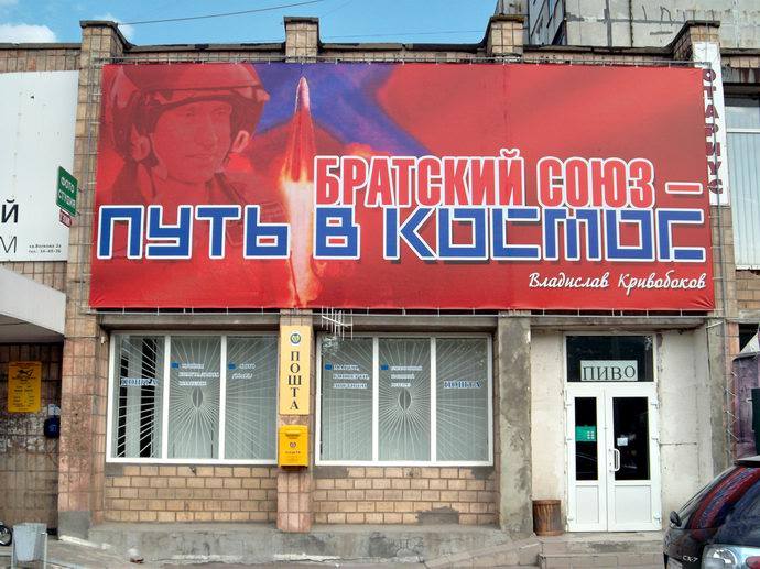 Во время выборов-2012, в том же Луганске, висел борд кандидата в депутаты Владислава Кривобокова с многозначительным лозунон "Братский союз - путь в космос".