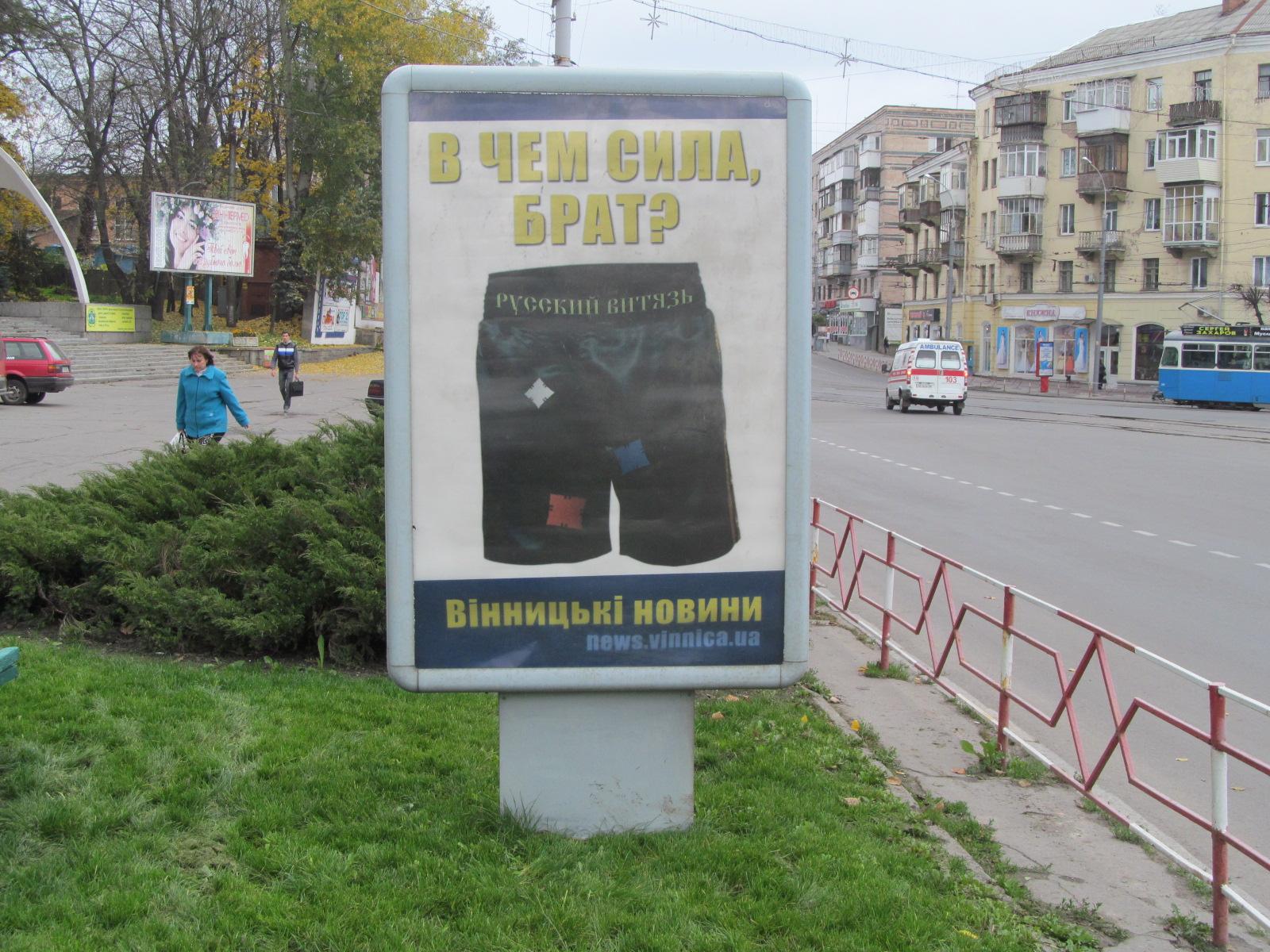 Винницкий сайт новостей рекалмируется трусами Поветкина. На сити-лайтах города появилась реклама информационного ресурса Вінницькі новини в виде трусов "русского витязя" и слогана "в чем сила, брат?".