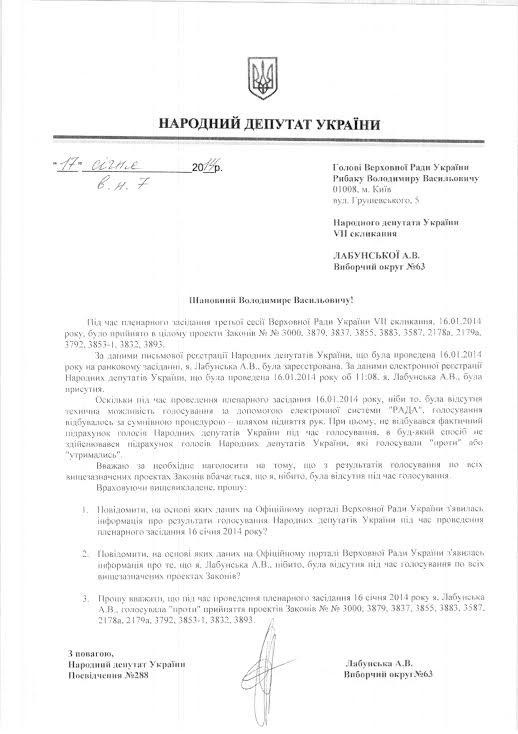 "Именно поэтому народный депутат Украины Анжелика Лабунская* (избирательный округ № 63) не только просит считать ее голос таким, что был ПРОТИВ всех вчерашних законопроектов, но и обратилась к Рыбаку В.В. с целью установить инструментарий подсчета голосов на вчерашней сессии", - сказано в сообщении.