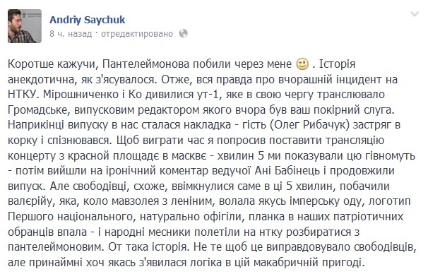 Один із ведучих Громадське ТV, журналіст Андрій Сайчук розповів про своє бачення скандальної ситуації із побиттям нардепами в.о. президента Національної телерадіокомпанії України Олександра Пантелеймонова, заявивши, зокрема, що інцидент стався через нього.