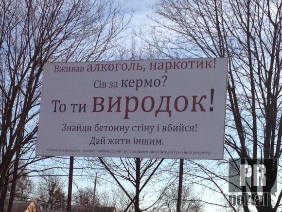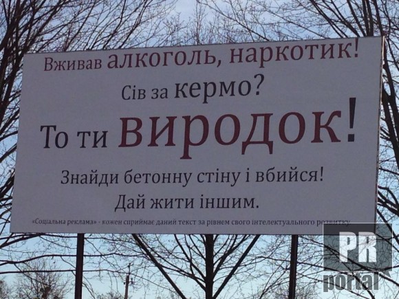 Агрессивная социалка против вождения в алкогольном или накротическом опьянении гласит: "Вживав алкоголь, наркотик! Сів за кермо? То ти ВИРОДОК! Знайди бетонну стінну і вбийся! Дай жити іншим."