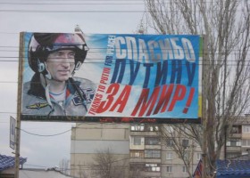 В социальной сети Facebook обсуждают бигборд в Луганске с изображением Владимира Путина и подписью "Спасибо Путину за мир!".