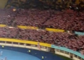 Во время отборочного матча чемпионата Европы по футболу между Австрией и Россией болельщики "раскрасили" часть трибун стадиона "Эрнст Хаппель" в Вене в цвета украинского флага.