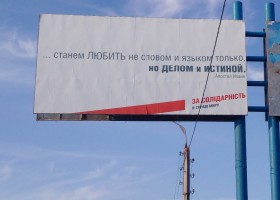 Люби меня по-французски, раз это так неизбежно...Президентская «Солидарность» обещает отлюбить краматорских избирателей, причем святыми устами Апостола Иоанна. Об этом сообщают билборды партии с лозунгом «За Солідарність в справі миру».