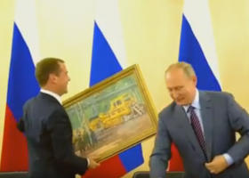 Президент России Владимир Путин во время президиума Госсовета в Керчи поздравил премьер-министра Дмитрия Медведева с прошедшим днем рождения и подарил ему картину «В цеху».