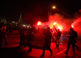 В центре Москвы активисты устроили акцию в поддержку Майдана. Они прошли по Софийской набережной и сожгли несколько файеров и флаг Новороссии. Активисты несли баннер с надписью «Вчера Киев — завтра Москва»