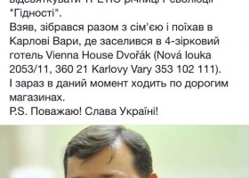 "Справжній патріот України і борець з корупцією вирішив радикально відсвяткувати третю річницю Революції "Достойності". Взяв, зібрався разом з родиною і поїхав до Карлових Вар, де заселився в 4-зірковий готель Vienna House Dvořák. І в даний момент ходить по дорогих магазинах" , - написав журналіст.