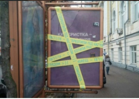 Сьогодні сексистські рекламні плакати уже були переклеїні стрічками з написами "стереотипи під наглядом".