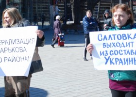 «Салтовка выходит из Украины», «Холодная гора объявила визовый режим», «Папа вошёл в состав другой семьи», «Страус хочет выйти из состава зоопарка» и даже «Мочевой пузырь решил войти в состав головного мозга» — под такими лозунгами прошла сегодня "сепаратистская" акция у стеклянного входа станции