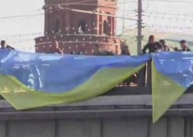 У стен Кремля на Большом Каменном мосту в День Независимости Украины был вывешен флаг Украины.