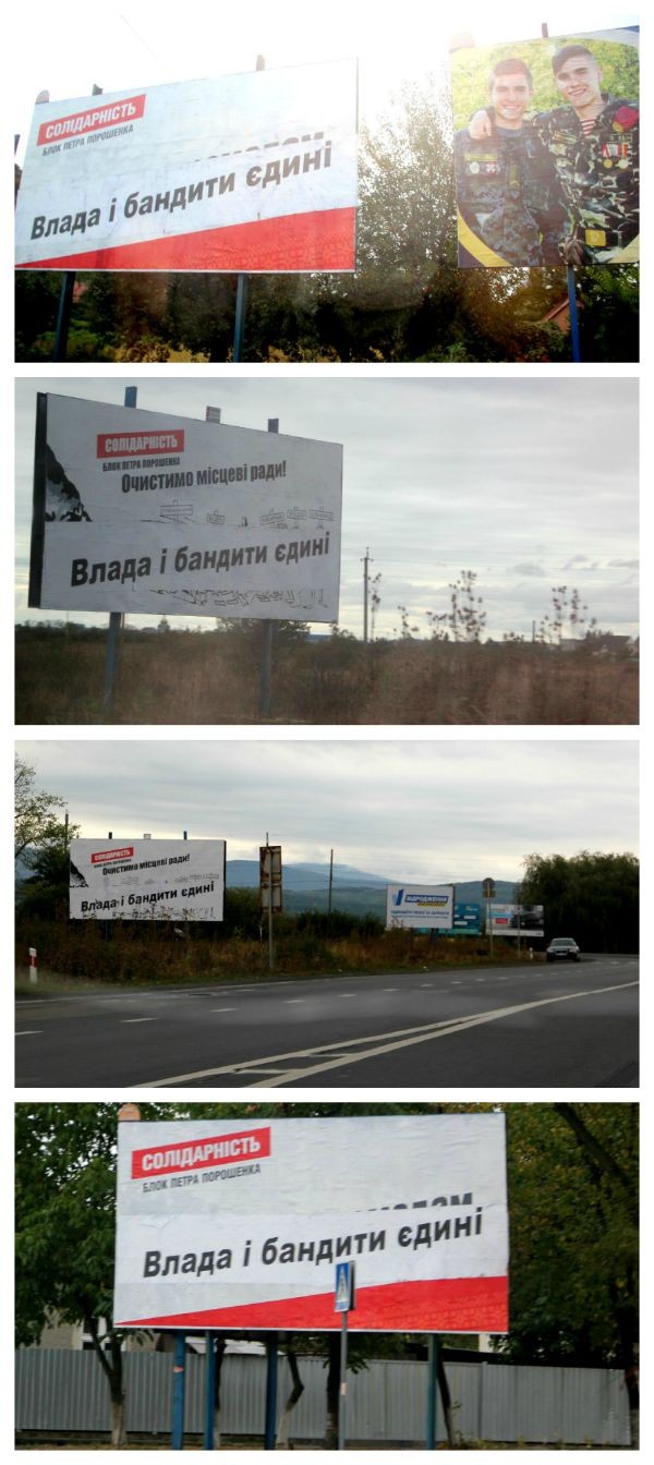 "Впродовж минулих вихідних, коли більшість людей відпочивала після важкого робочого тижня, якась компанія мукачівців розвинула бурхливу діяльність та зіпсувала всі 10 білбордів, які розмістила в місті Закарпатська обласна організація партії «Солідарність – Блок Петра Порошенка».