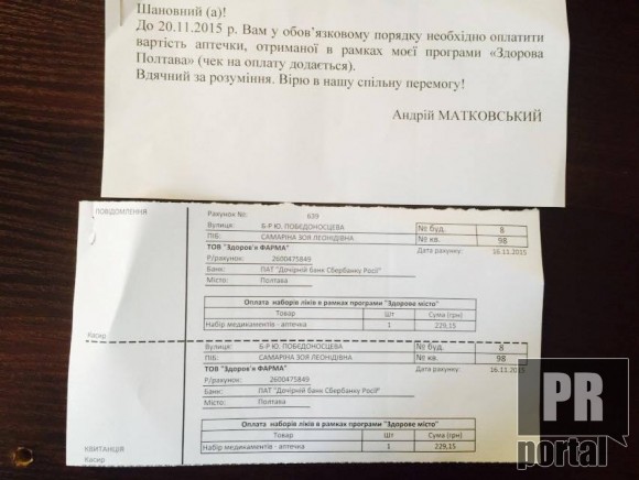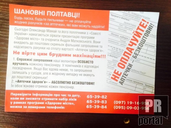 Конкуренти дізнавшись про таку акцію, почали роздавати полтавчанам фальшиві рахунки за ліки. В них вказано, що ці аптечки потрібно обов'язково оплати та щей російському Сбербанку.