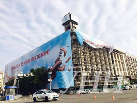 Будинок профспілок у Києві на Майдані Незалежності до «Євробачення» накрили великим панно. Про це повідомляє УНН.