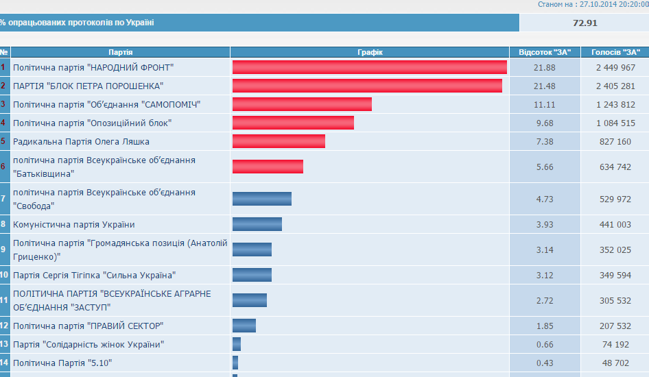 Станом на 20.20 Центральна виборча комісія опрацювала 72.91% протоколів.