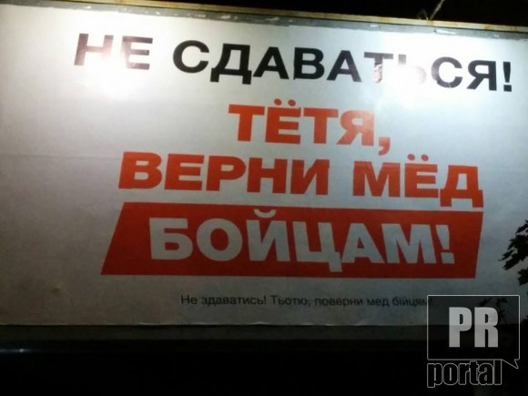 Нагадаємо, що у різних частинах Дніпра з'явилися білборди з надписом «Не сдаваться! Тетя, верни мед бойцам!». У соцмережах стверджують, що повідомлення стосується рідної тітки лідерки "Батьківщини" Юлії Тимошенко – Антонини Ульяхіної. У самій «Батьківщині» плакати називають «брудними технологіями».