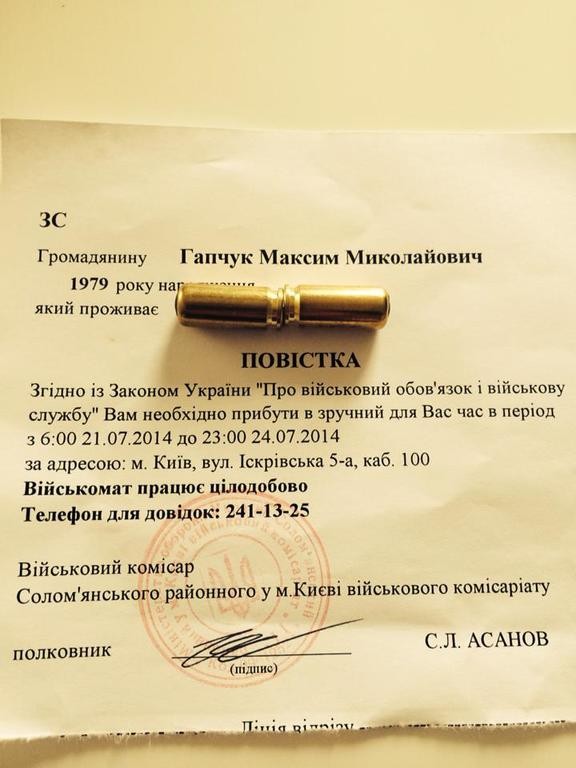 Депутату Киевсовета Максиму Гапчуку пришла повестка из военкомата. Об этом сам Гапчук написал в среду, 23 июля, на своей странице в соцсети Facebook, передает "Обозреватель".