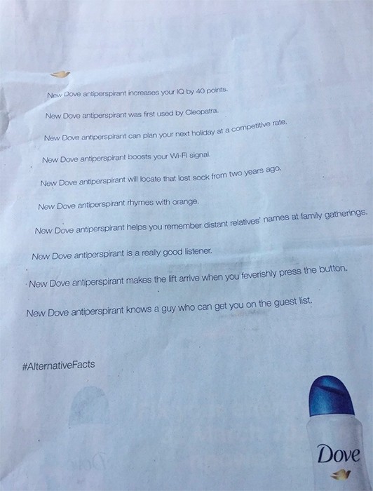 «Новый антиперспирант Dove увеличит ваш IQ на 40 пунктов», «Новый антиперспирант Dove впервые был использован Клеопатрой», – гласили надписи на странице и стоял хештег #AlternativeFacts. На другом развороте был изображен тот же флакон, но с хештегом #RealFacts сообщалось, что «Новый антиперспирант Dove ухаживает за кожей ваших подмышек, как никогда раньше».