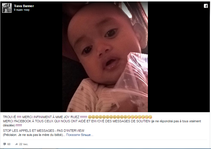 Мати дитини – Тіава Бане – опублікувала на своїй сторінці фото малюка і попросила допомогти знайти його. Згодом їй допомогли розшукати немовля, пише ТСН