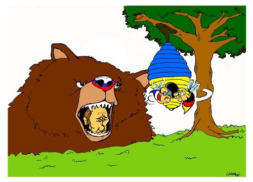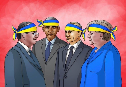 Персонажами шаржів, крім Володимира Путіна, Ангели Меркель і Франсуа Олланда,також стали Барак Обама, Петро Порошенко, Сергій Лавров і глава МЗС Німеччини Франк-Вальтер Штайнмаєр. Причому західні карикатури говорять про холодну війну ізахеканого голуба миру,пише Корреспондент