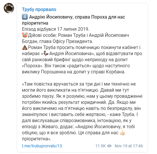 - Дело Порошенко. Глава ГБР Роман Труба обсуждал с главой Офиса Президента Андреем Богданом вопрос вызова на допрос в Бюро пятого президента. Это свидетельствует о том, что дела против Петра Порошенко лично контролирует Богдан.