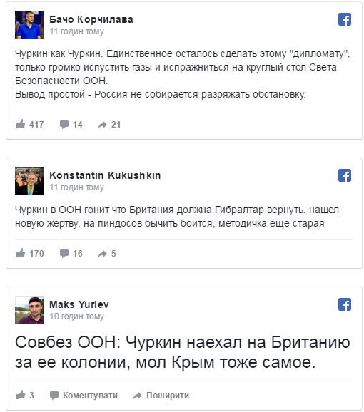 "Вновь о проблеме Крыма, причем же довольно агрессивно, как всегда, заговорил представитель соединенного королевства. Вновь сказав, что кризис в Украине начался именно с Крыма. Я не могу вновь не напомнить, что все началось с государственного переворота, во многом при поддержке из вне. Что касается позиции Соединенного королевства, то хочу посоветовать — верните Мальвинские острова, верните Гибралтар, верните аннексированную вами часть Кипра, верните архипелаг Чагос в Индийском океане, который вы превратили в огромную военную базу. Тогда ваша совесть, может быть, будет чуть более чиста и вы сможете рассуждать на другие темы", — сказал представитель страны агрессора во время заседания Совбеза ООН, – передает inforesist.org.