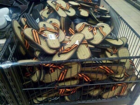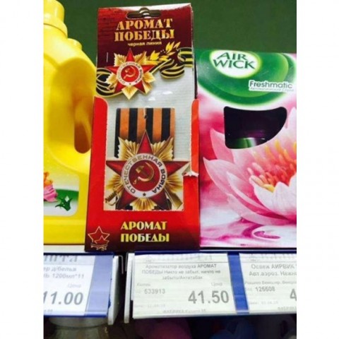 Більшість виробників прикрашають свою продукцію на прилавках у магазинах георгіївськими стрічками або наліпками, серед яких – освіжувачі повітря, банани, паштети, майонези.
