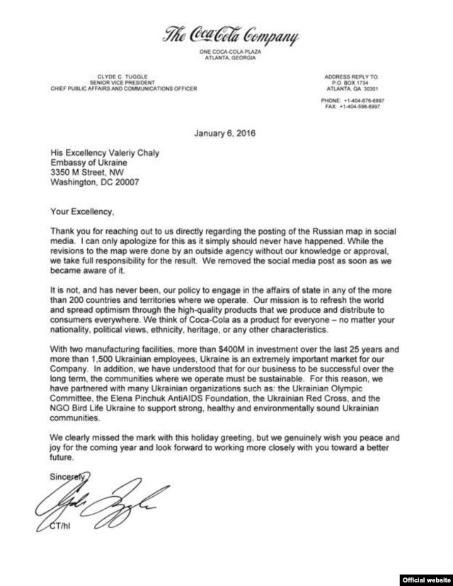 Кейт Ірвін (вона обіймає в компанії Coca-Cola посаду директора з дипломатичних відносин – Ред.) передала листа від старшого віце-президента компанії Клайда Таґґла на ім’я посла України у США Валерія Чалого з вибаченням за цю публікацію. Як заявили в компанії, зміст цієї публікації підготувало незалежне агентство без відома компанії Coca-Cola та погодження з нею. Але, мовиться в листі, компанія бере на себе повну відповідальність за це. У листі також наголошено, що компанія негайно усунула цю публікацію, як тільки отримала інформацію про становище, що склалося.