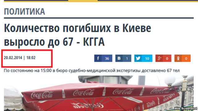 «20 февраля российские СМИ сообщили о якобы 67 жертв в результате столкновений в центре Киева. Так, на сайте российского издания Lenta.ru со ссылкой на украинское информационное агентство УНИАН сообщили: «В период с 18 по 20 февраля в результате столкновений в Киеве погибли 67 человек», - говорится в сообщении.