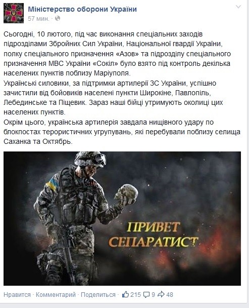 На офіційній сторінці Міністерства оборони України у Facebook з'явилося повідомлення про те, що 10 лютого під час спецоперації військовослужбовців ЗСУ, Нацгвардії, полиця "Азов" і підрозділу "Сокіл" українська сторона взяла під контроль кілька населених пунктів у районі Маріуполя. Від сепаратистів зачистили Павлопіль,Широкино, Лебединське і Пішевік.