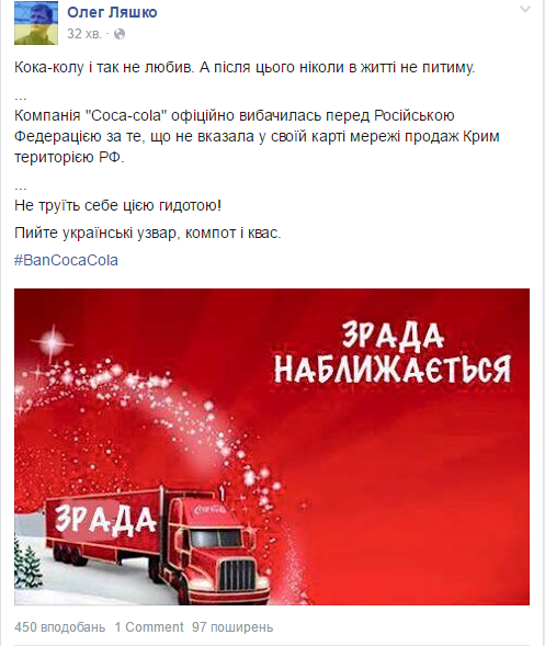 "Предлагаю гражданам Украины в ответ вернуть компанию Coca-Cola на землю и отказаться от покупки продуктов компании, заодно напомнив, что ни в одной стране мира, в том числе, на родине Coca-Cola (США) Крым не признается территорией России, события на полуострове называются оккупацией, в связи с чем к РФ применяются экономические санкции.", - написав нардеп у Фейсбук