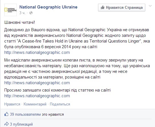 Украинская редакция издания National Geographic уже отреагировала на материал иностранных коллег и направила в редакцию письмо, в котором обращает внимание на несбалансированность материала. В редакции отмечают, что они не получали от американского издания ни одного запроса по этой статье. "Еще раз подчеркиваем, что украинская редакция не является частью американской редакции, а потому не несет ответственности за материалы, размещенные на сайте", - говорится в сообщении National GeographicUkraine.