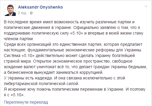 "Серед всіх організацій це єдина партія, яка пропонує справжні, фундаментальні економічні реформи для України", - написав Онищенко.