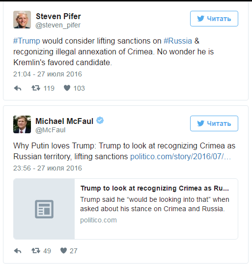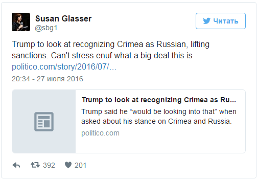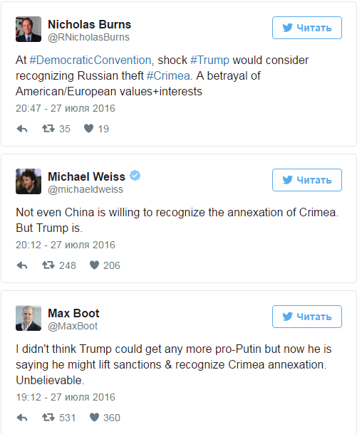 "Не думав, що Трамп може бути ще більш пропутінським, але тепер він каже, що може зняти санкції та визнати анексію Криму. Неймовірно", - пише у Twitter дослідник аналітичного центру CFR Макс Бут.