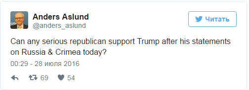 Відомий фахівець з економіки Росії і старший науковий співробітник Атлантичної ради в Вашингтоні Андерс Ослунд дивується, як республіканці можуть підтримувати Трампа. "Хіба може хоч один серйозний республіканець підтримувати Трампа після його сьогоднішніх заяв про Росію і Крим?" - написав він у Twitter.