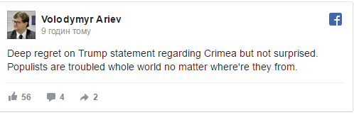 "Дуже розчарований з приводу заяви Трампа по Криму, але не здивований. Популісти – це проблема усього світу, незалежно від того, звідки вони", - написав він у Facebook.
