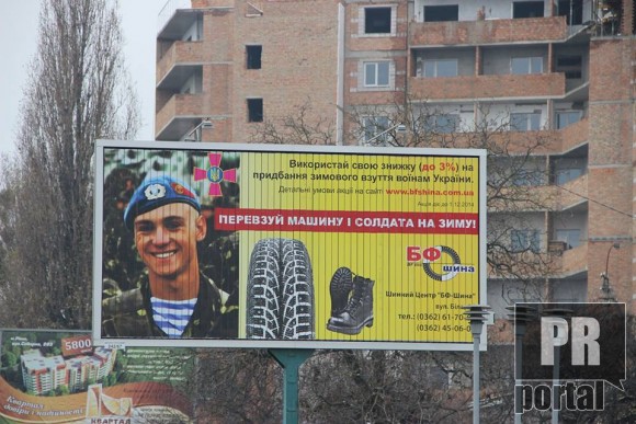 Яскравим прикладом є акція, яку організувала «БФ-шина». У місті Рівне на вулицях міста можна побачити білборд з зображенням усміхненого солдата і надписом: «Перевзуй машину - і солдата на зиму!».