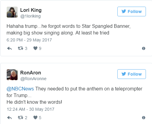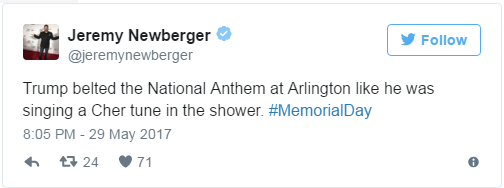 Однак особливу увагу користувачів Мережі під час урочистої події привернула поведінка Трампа під час виконання гімну країни. Очільник держави хитався назад і вперед, бив себе злегка по грудях, а потім почав підспівувати з більшим ентузіазмом, ніж потрібно було в цьому випадку. Деякі юзери почали жартувати, що це було схоже, ніби президент співає пісню Шер у душі.
