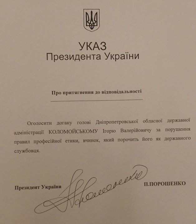 Президент Петро Порошенко оголосив догану дніпропетровському губернатору Ігорю Коломойському.