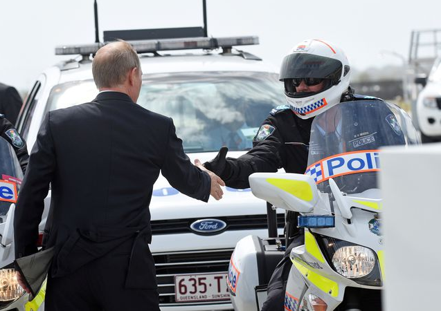 Обнаружив это, Путин неожиданно подошел к полицейским из эскорта и крепко пожал им руки,сообщают ФАКТЫ.ICTV.