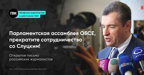 Російська незалежна Профспілка журналістів та працівників ЗМІ закликала колег та Парламентську асамблею ОБСЄ не співрацювати з главою комітету Державної думи Росії з міжнародних справ Леонідом Слуцьким, якого звинуватили в домаганнях.