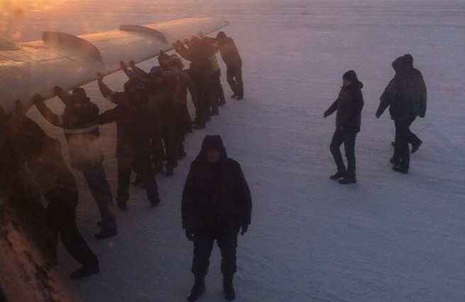 В Красноярском крае пассажирам при минус 50 градусах пришлось толкать Ту-134, примерзший к площадке перед взлетно-посадочной полосой. ЧП с лайнером произошло накануне утром в аэропорту Игарки. Перед взлетом столбик термометра опустился до -52 градусов, поэтому шасси примерзло к покрытию аэродрома, не давая самолету выехать на взлетно-посадочную полосу и совершить разгон.