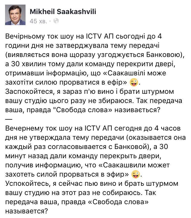 "Вечірньому ток шоу на ICTV АП сьогодні до 4 години дня не затверджувала тему передачі (виявляється вона щоразу узгоджується з Банковою), а 30 хвилин тому дали команду перекрити двері, отримавши інформацію, що «Саакашвілі може захотіти силою прорватися в ефір». Заспокойтеся, я зараз п'ю вино і брати штурмом вашу студію цього разу не збираюся. Так передача ваша, правда "Свобода слова» називається?", - написала у фейсбук прес-служба Михайла Саакашвілі