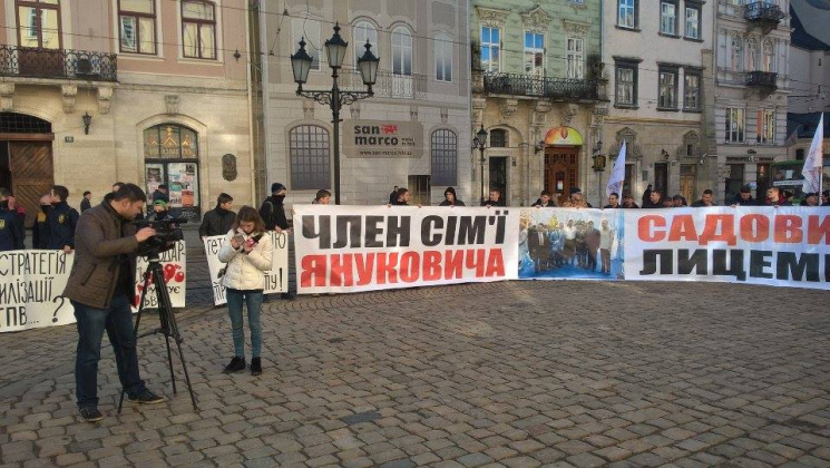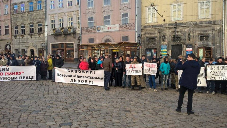 Протестуючі тримають плакати: "Член сім'ї Януковича. Садовий - лицемір", "Весна прийшла – бездоріжжя принесла", "Де стратегія утилізації ТПВ?", "Андрійку, скоріше сядеш – скоріше вийдеш", "Громаду не чують", "Львів без Садового", "Геть корупцію у сфері транспорту", "Львів – не смітник. Садовий, іди геть!" та інші.