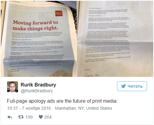 Samsung Electronics выкупила по целой полосе в The Wall Street Journal, The New York Times и The Washington Post, чтобы опубликовать в них извинения перед покупателями за провал смартфона Galaxy Note 7. На это обратило внимание The Verge.