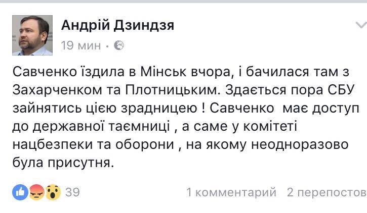 "Надія Савченко їздила в Мінськ вчора, і бачилася там з Захарченком та Плотницьким", - написав у себе на Фейсбук активіст Андрій Дзиндзя