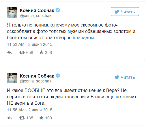 «Я тільки не розумію, чому моє скоромне фото ображає, а фото товстих чоловіків, обвішаних золотом і брегетом (марка швейцарських годинників класу «люкс». – ред. ) впливає благотворно. І який це все має стосунок до Віри? Не вірити в те, що ці люди – ставленики Божі, ще не означає не вірити в Бога», написала Собчак у Twitter.