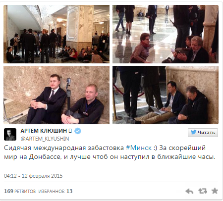 В среду 11 февраля в Минске стартовали переговоры Нормандской четверки по урегулированию кризиса на Донбассе. Встреча началась около семи часов вечера и продолжалась больше 14 часов без перерыва. Всю ночь вместе с главами Украины, России, Германии и Франции в Дворце Независимости провели многочисленные делегации и журналисты,пишет Сегодня.ua.Ночные фото с места переговоров, которыми делятся присутствующие в Твиттер