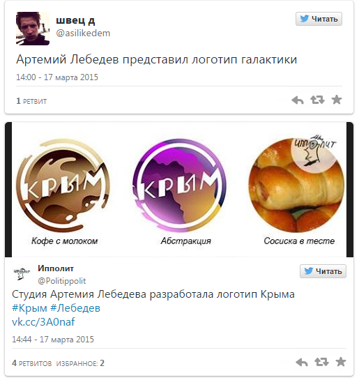 Політтехнолог Андрій Демартіно, котрий довгйи час консультував кримського прем'єра Анатолія Могільова у себе на Фейсбук написав: "Самый известный «ватник» на россии Артемий Лебедев разродился логотипом Крыма. Не верю, что ЭТО создано в его арт-студии, такого качества травы в москве просто нет. Единственным мощным вдохновляющим образом мог стать севастопольский буёк, плотно обгаженный чайками. Эти белые разводы, так символичны и таким ярким мазком (как на костюме у самого ВВП) проходят через всю «коллекцию паттернов». С другой стороны, это может быть и тайным зашифрованным посланием (к этому Лебедеву давно надо повнимательней присмотреться). «Круг» - символ гнезда, «белые разводы» - понятно что, «жёлтый круг» - разбитое яйцо, как символ потомства. Декодировка – «не гадь в собственном доме и на собственное будущее». Не просто, ой как не прост этот Артемий…"