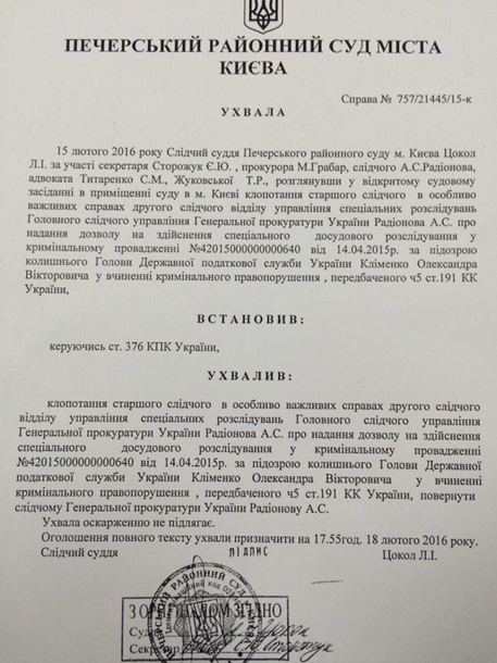 Ходатайство о начале заочного расследования против Клименко было направлено в Печерский суд еще 30 июня 2015 года.